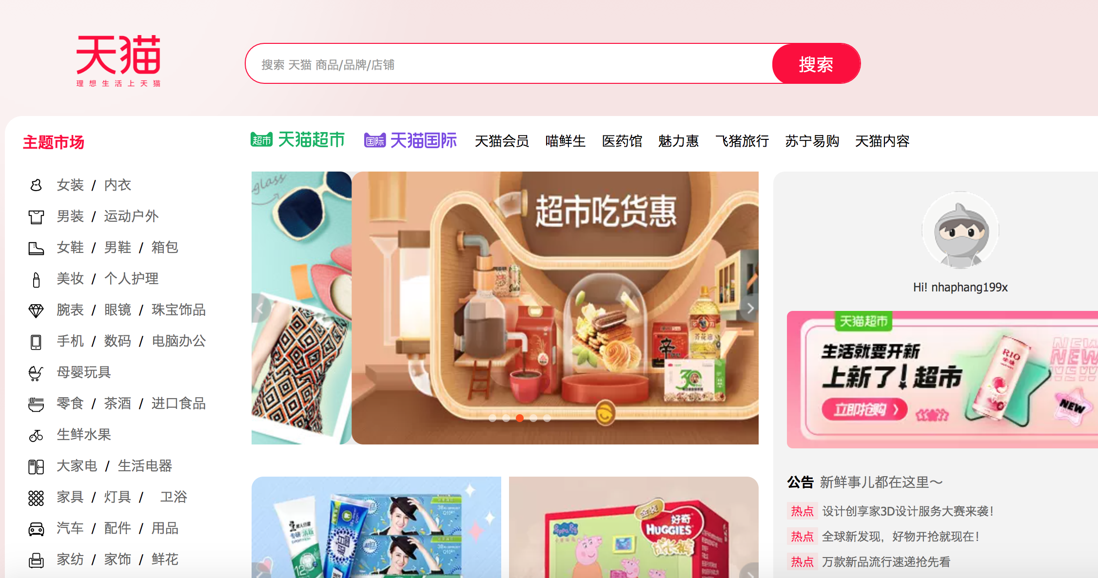 Tmall cũng là một trong những sàn thương mại điện tử của Trung Quốc. Tương tự 2 trang web trên, các bạn cũng có thể mua bất cứ món đồ gì trên đây.