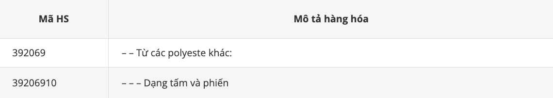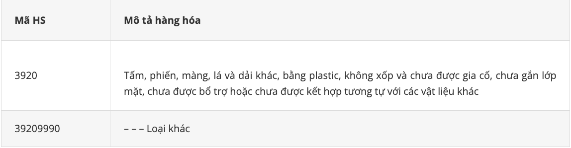 * Mặt hàng tấm nhựa, thùng đựng rác bằng nhựa có mã HS thuộc chương 39 – Plastic và các sản phẩm bằng plastic. Cụ thể: