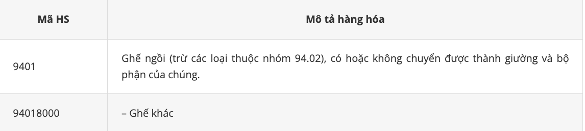 * Mặt hàng là ghế nhựa dành cho trẻ em có mã HS thuộc Chương 94 – Đồ nội thất; Bộ đồ giường, khung đệm, nệm và các đồ dùng nhồi tương tự; Đèn và bộ đèn, chưa được chi tiết hoặc ghi ở nơi khác; Biển hiệu được chiếu sáng, biển đề tên được chiếu sáng và các loại tương tự; Nhà lắp ghép.